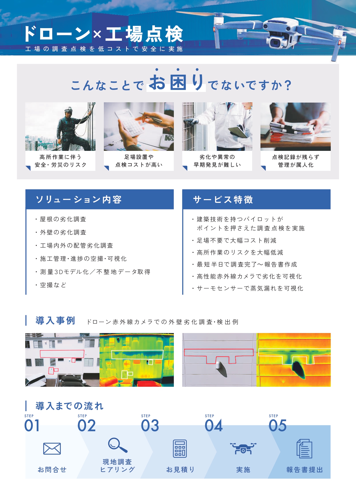 ドローン技術を活用した工場の調査・点検は、高所にあるガス配管や外壁の劣化状況を足場不要で詳細に撮影・分析し、コスト削減と工期短縮を実現することができます。